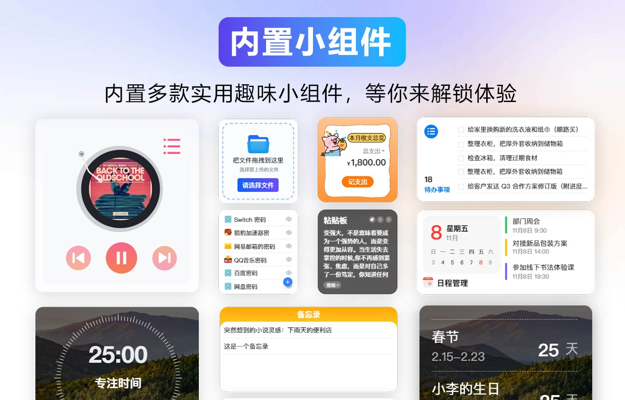 自由拖拽式布局:所有组件(时钟、音乐、待办、备忘录、网盘、密码等)均可自由调整大小、位置、透明度、配色,完全适配个人使用习惯;