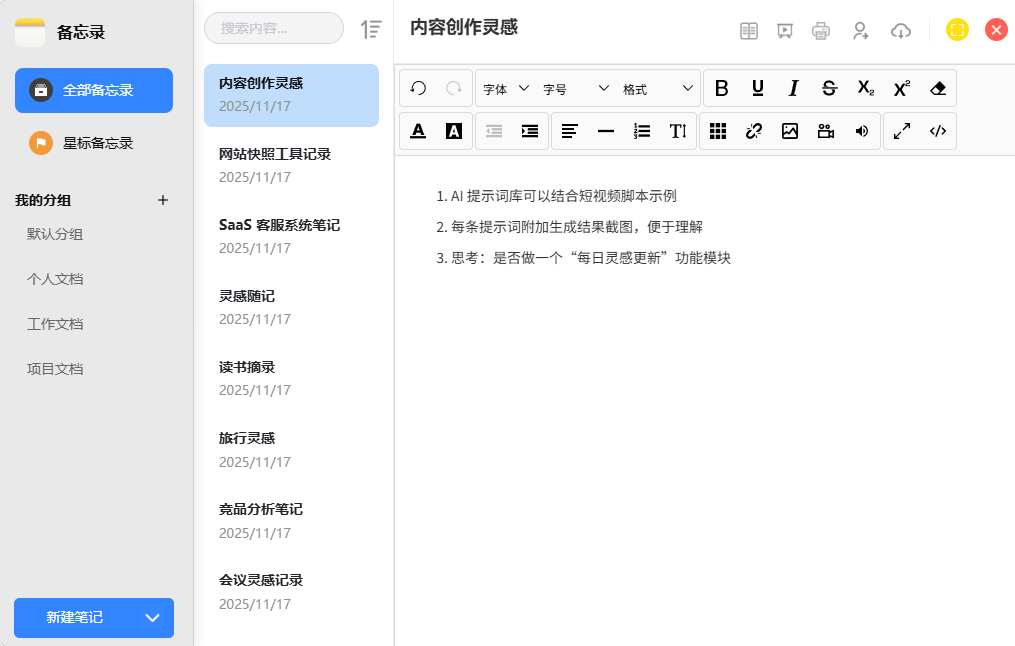的备忘录极其简洁,也非常好用:打开就能写,自动保存,支持简单排版。它没有花哨的功能,但胜在打开速度快、毫无干扰,真正做到了“随想随记”。后续还会上线小程序版本,这样就可以做到多端使用,多端同步了,非常方便。