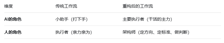 现在的逻辑:人提供结构化的上下文原材料 → AI主导生成 → 人负责最终的验收和发布