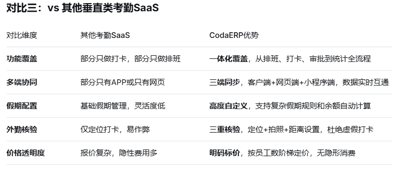 3、vs 其他垂直考勤SaaS:CodaERP提供一体化全流程覆盖(排班、打卡、审批、统计),三端数据实时同步,假期配置更灵活,外勤核验更严格,价格透明,按员工数阶梯定价。