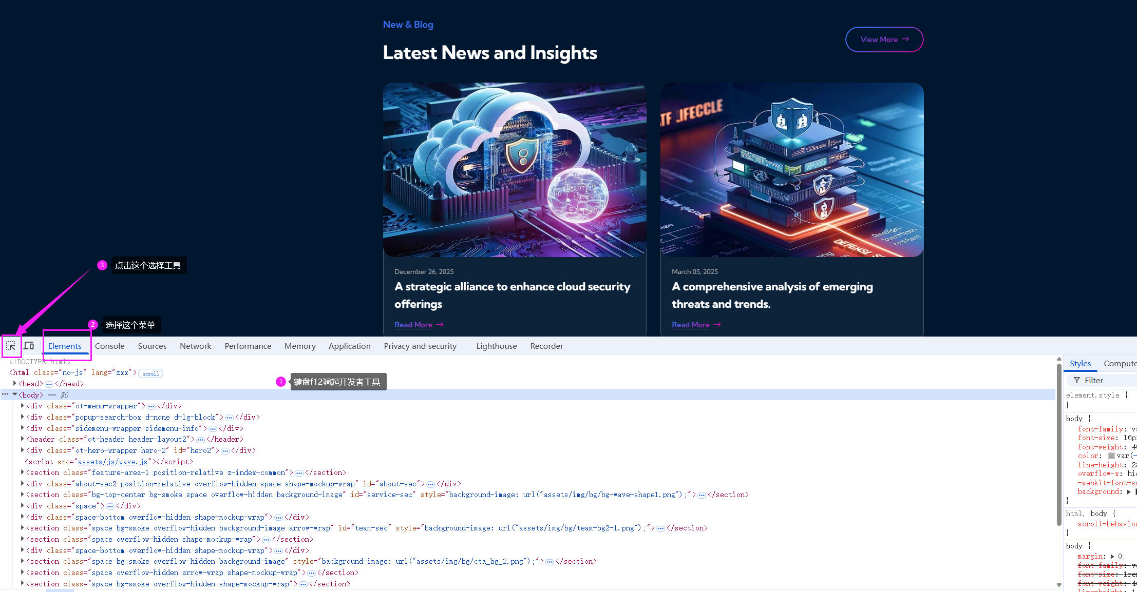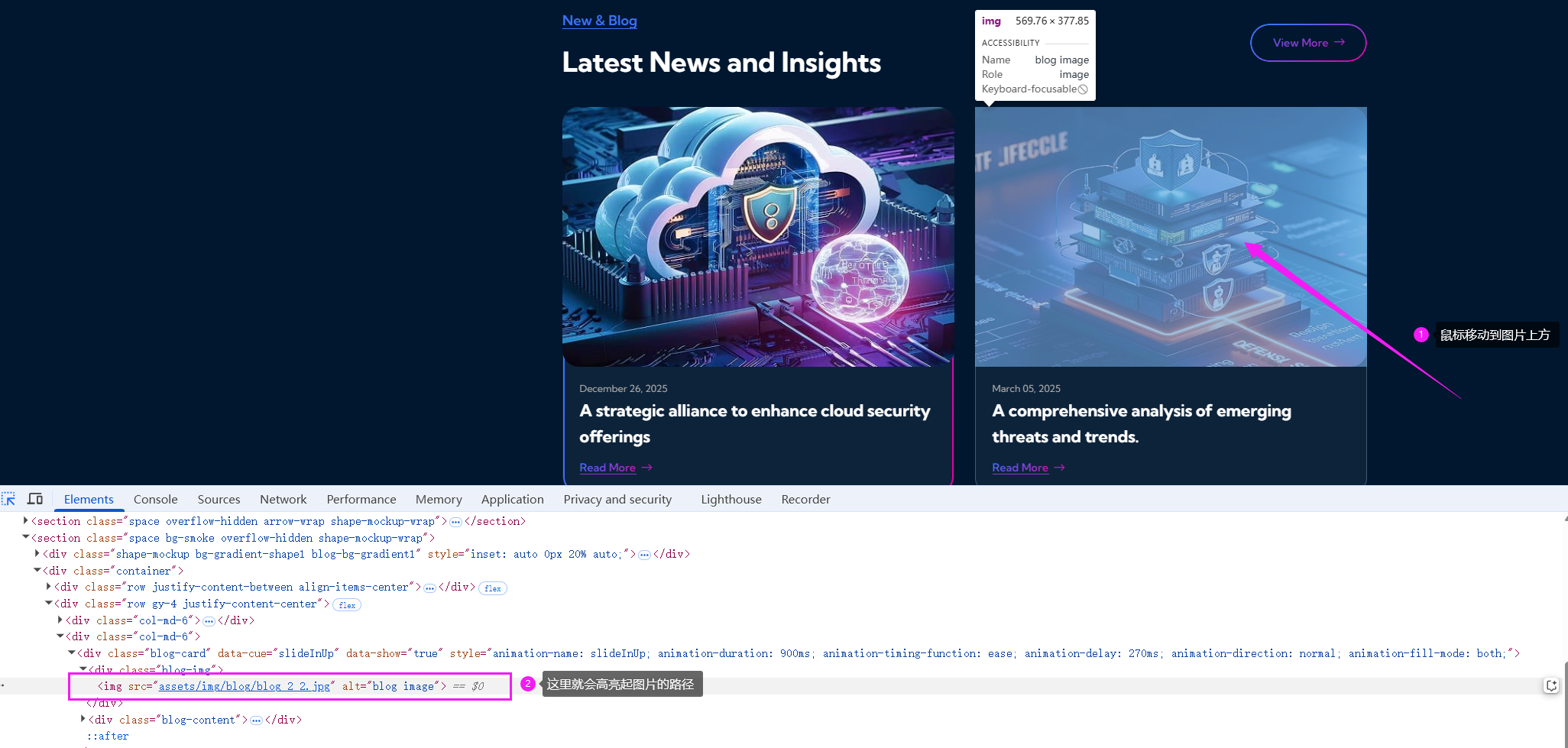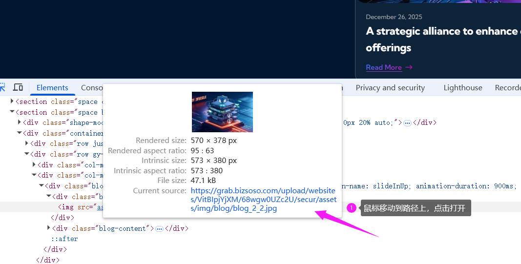 在使用网站快照工具快速复刻一个网页的前端样式之后,页面上的某些图片需要替换成自己的品牌素材,该怎么做呢?今天这个教程就教会大家,只要几分钟,就可以在线替换网页图片,下面我们一步步来完成。 点击任务预览打开网页,按下键盘上的 F12 键,调出浏览器的开发者工具。 然后选择“元素选择器”,将鼠标移动到你想替换的图片上方,在代码区域中就会显示这张图片对应的文件路径。