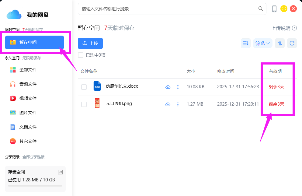 你上传的任何文件,都会进入临时空间,7天后自动清理。上班没做完的,随手拖进去,回家下载继续,完成后归档或者让它自动消失。