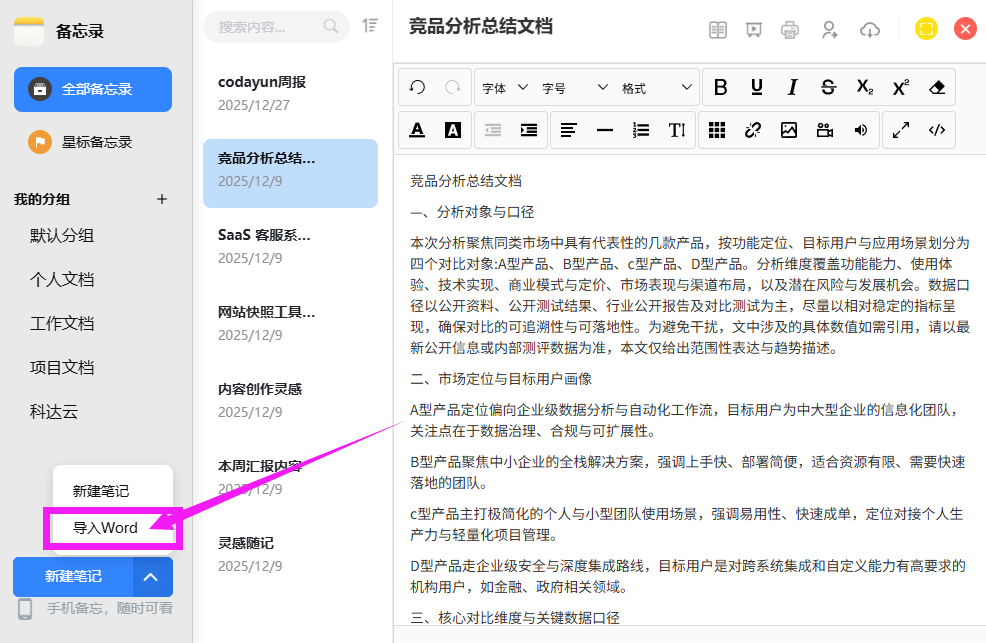 首先它可以一键导入你电脑里面的word文档,方便你将文稿上传上来编辑或者备份。